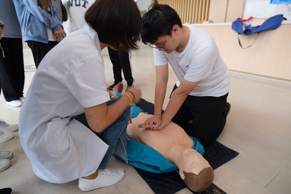 此外,医务室的老师还向同学们为大家用生动形象的语言讲解了心肺复苏、气道异物梗阻急救、创伤救护、止血包扎等基本救护知识,并进行现场实操演示。