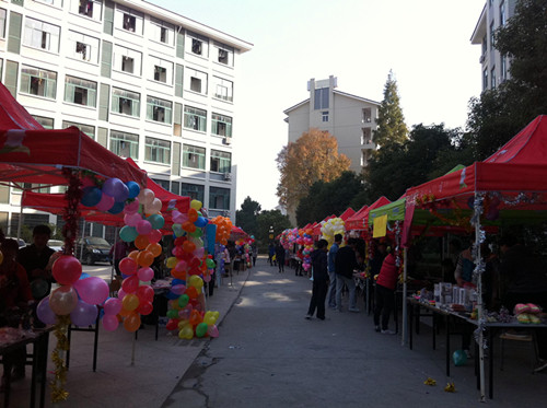 在学院10号-12公寓楼中间的广场上,二十支参赛队伍搭成了两排商品街,玲琅满目的商品形成了一片独特的风景区。迎着朝阳,参赛选手们搭台陈列,开始了一天的比赛。促销形式多种多样,比赛场面火爆热烈,参赛选手们充分发挥团队精神、合理分工、采用了各种促销手段拉动销售额,来创出促销的佳绩。经过一天的促销比赛,最后产生一等奖1组,二等奖2组,三等奖3组和优胜奖2组。