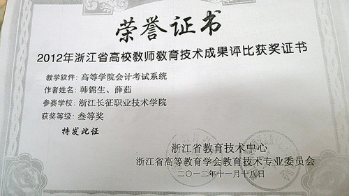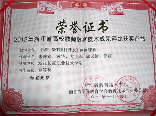 我院朱静宜、黄华、方正华、周天绮、邵红等教师研究制作并申报的《ASP.NET项目开发》网络课程教学软件,韩锦生、薛茹等教师研究制作并申报的《高等学院会计考试系统》教学软件,荣获2012年度浙江省高校教师教育技术成果评比三等奖。